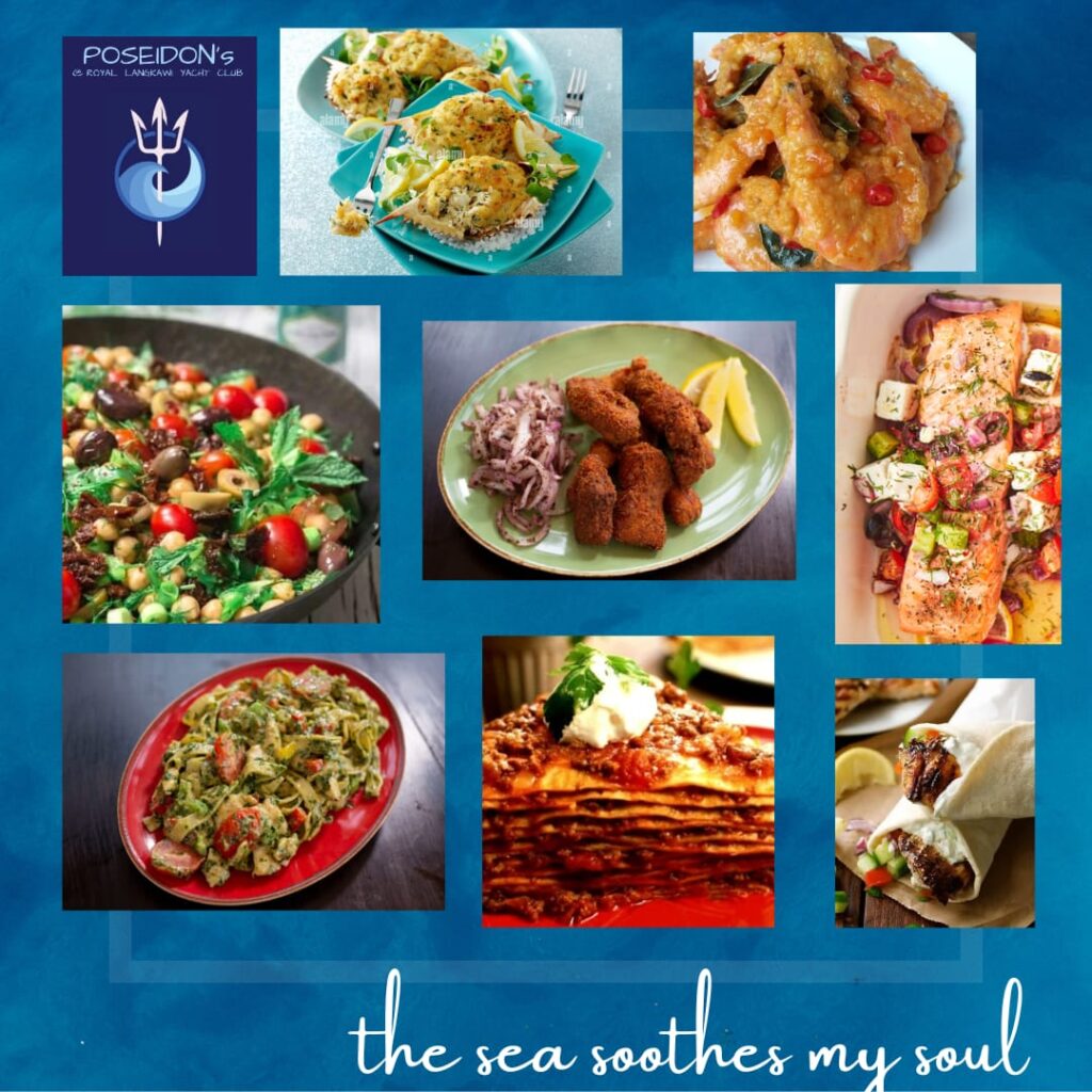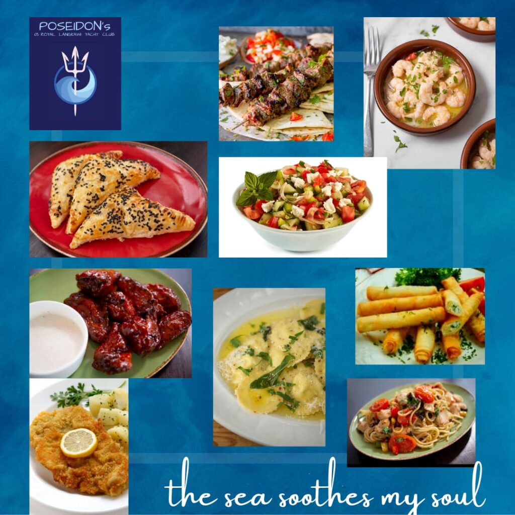 Poseidon’s is located at the pool area of the club. Poseidon serves Mediterranean cuisine, from Spanish tapas to Greek cuisine, Italian pasta, and Turkish cuisine. It boasts a beautiful assortment of different tantalising flavours that will tease and delight your taste buds. Poseidon’s provides a chill and relaxed setting nestled at the poolside with a spectacular sunset where the ocean meets the sky and the marina yachts set a romantic mood. The array of colours that adorn the sky is nothing short of breathtaking. One can enjoy watching the playful monkeys and hornbills as they feast on berries from the nearby trees. As the sun sets and night falls during the squid fishing season, one can witness the beautiful green glow from the fishing boats of the squid fishermen that illuminate the night sky. It is truly surreal.